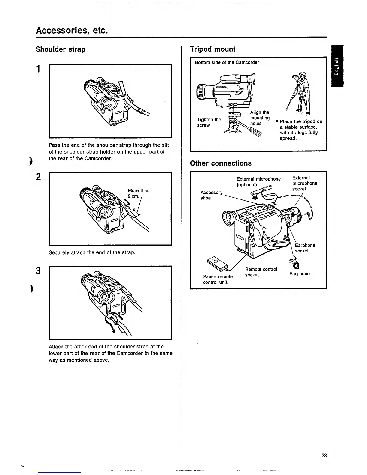 Philips VKR6853/21 - Camcorder Accessories and Connections; Shoulder Strap Attachment; Tripod Mount Usage; External Connections Overview