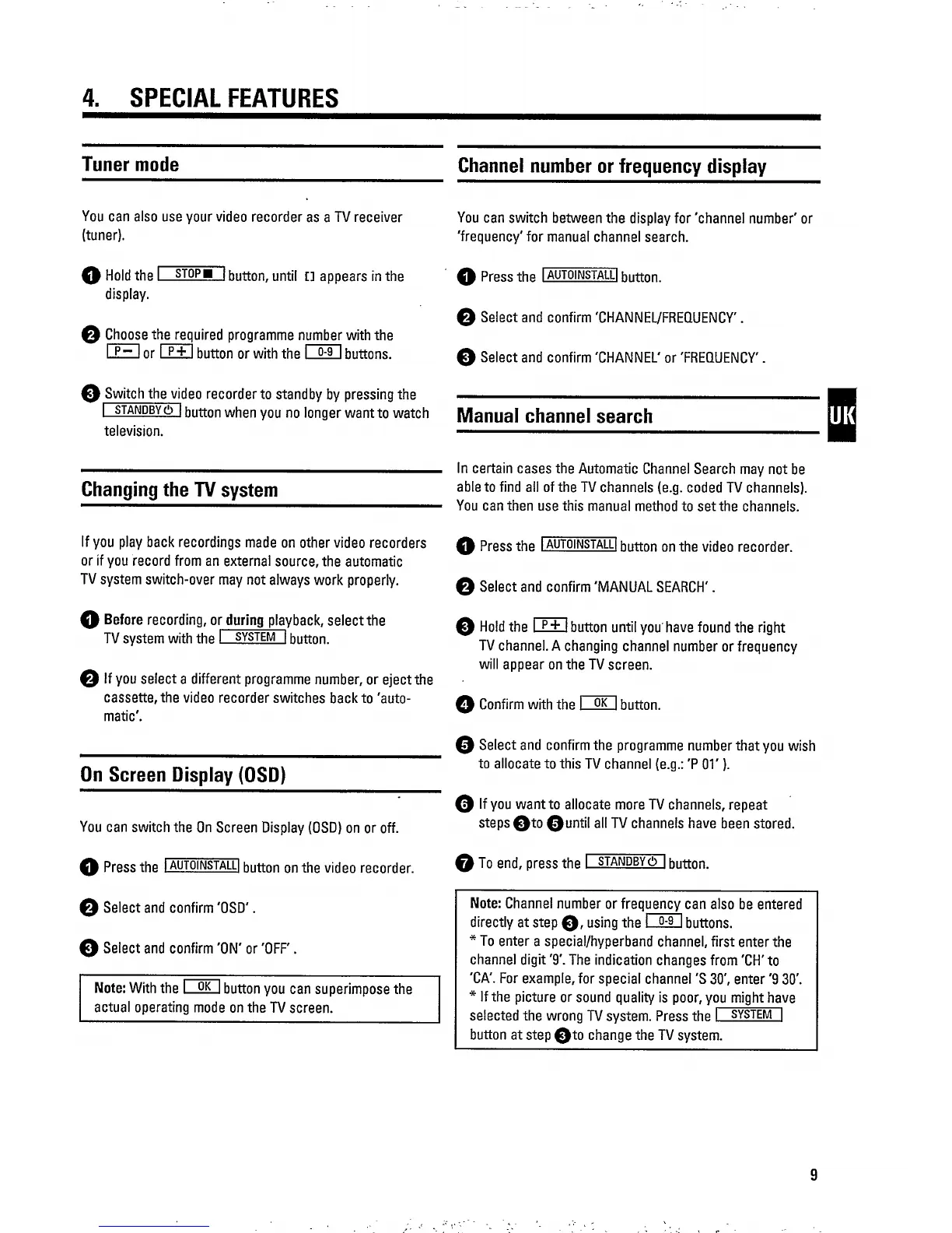 Philips VR 475 - Special Features; Tuner Mode; Changing TV System; On-Screen Display (OSD)