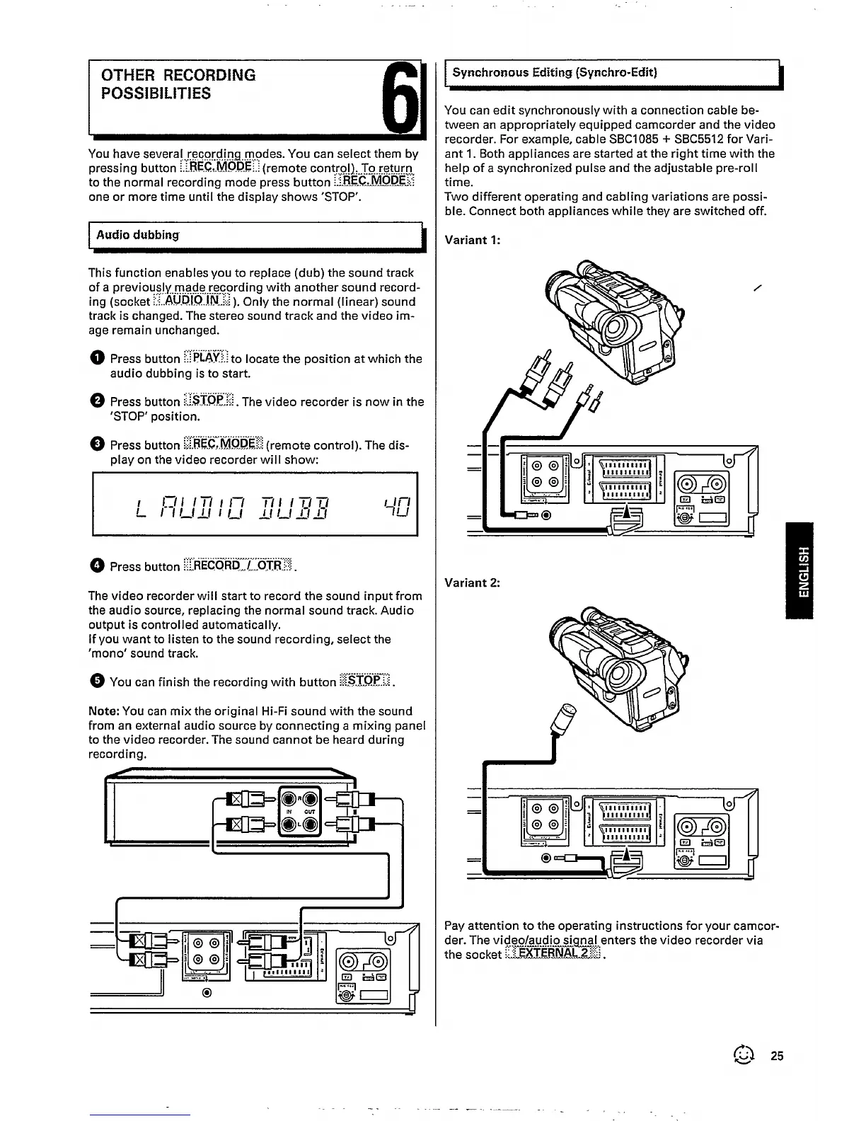 Philips VR 522 - OTHER RECORDING POSSIBILITIES; Audio dubbing; Synchronous Editing (Synchro-Edit)