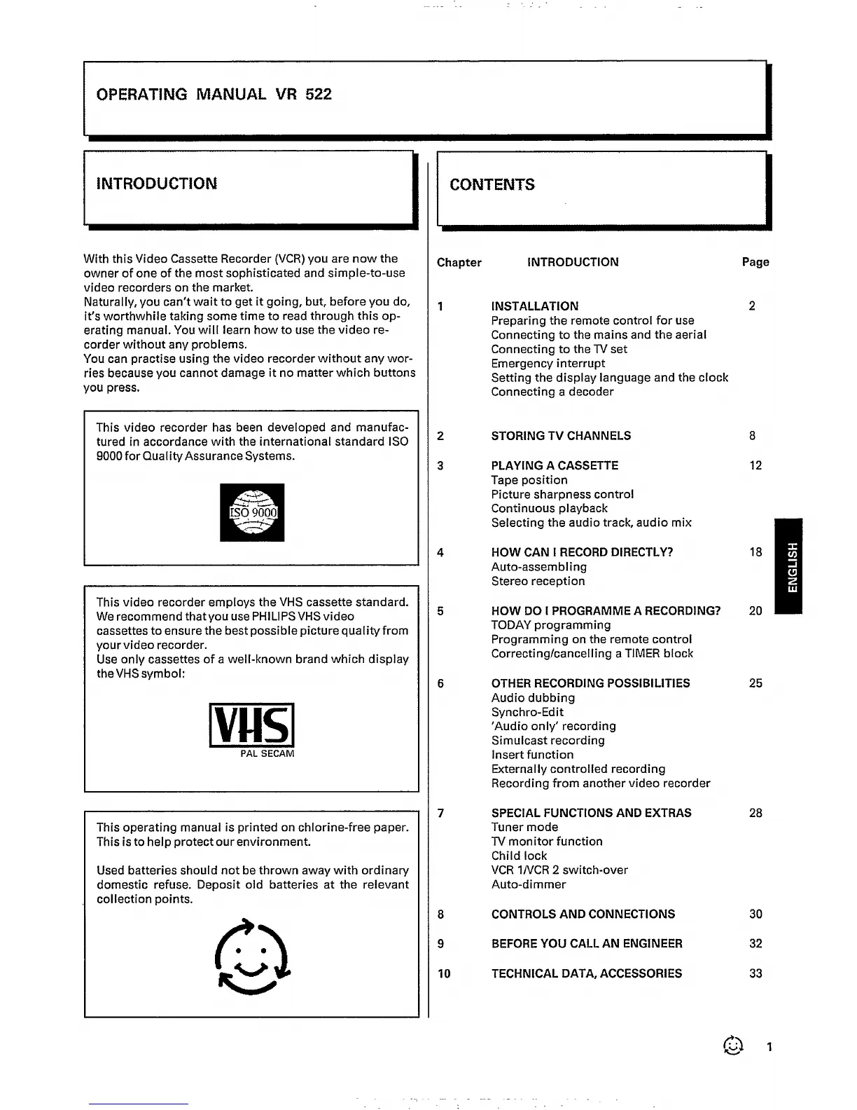 Philips VR 522 - INTRODUCTION; INSTALLATION; STORING TV CHANNELS; PLAYING A CASSETTE