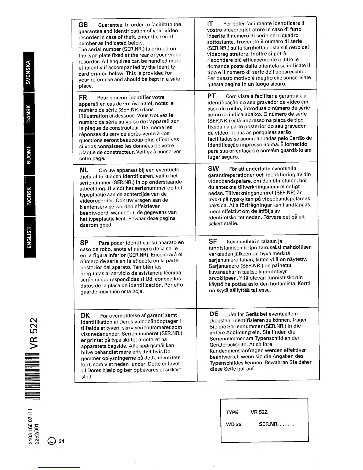 Philips VR 522 - Record Serial Number for Guarantee and Identification