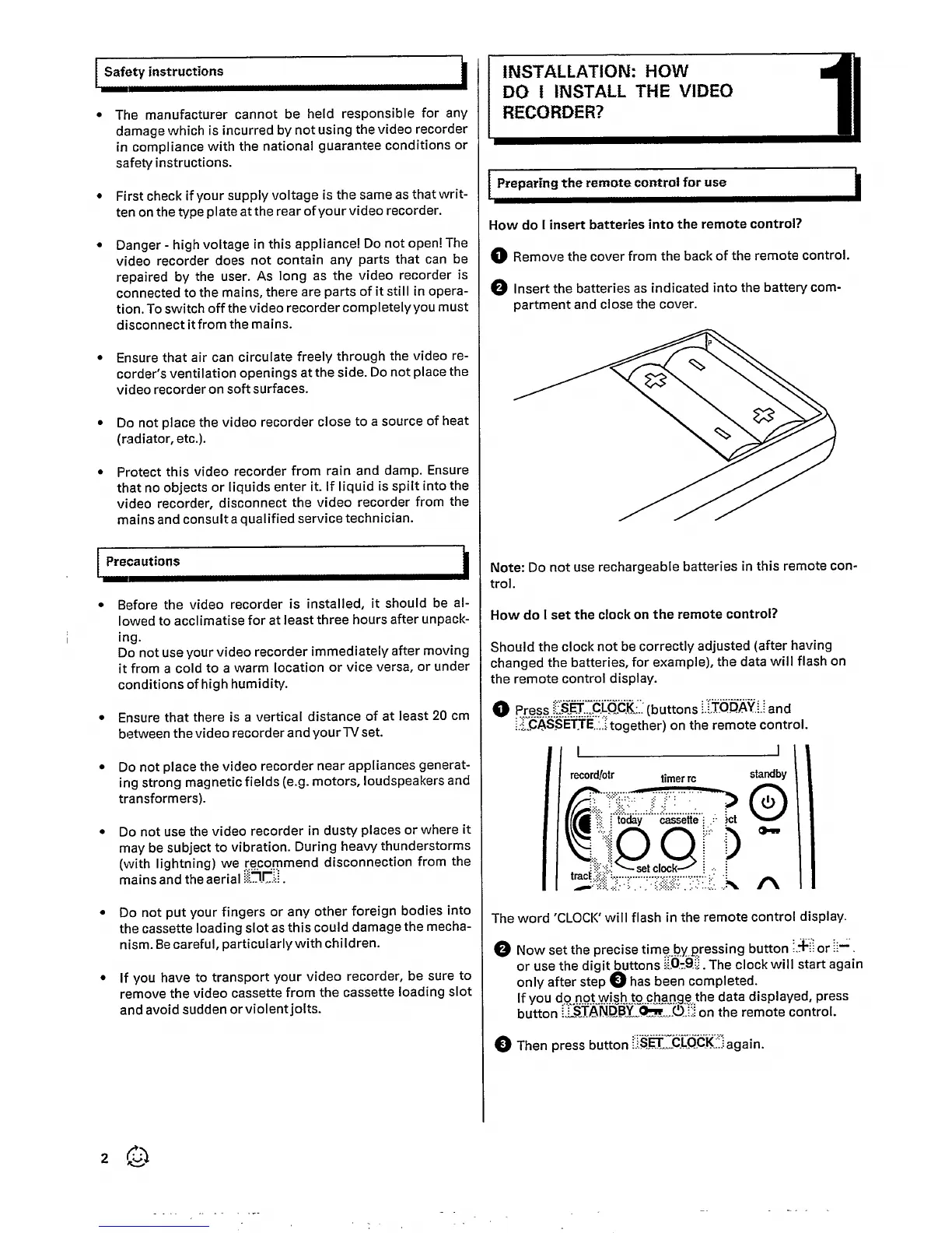 Philips VR 522 - INSTALLATION: HOW DO I INSTALL THE VIDEO RECORDER?; Preparing the remote control for use; How do I set the clock on the remote control?