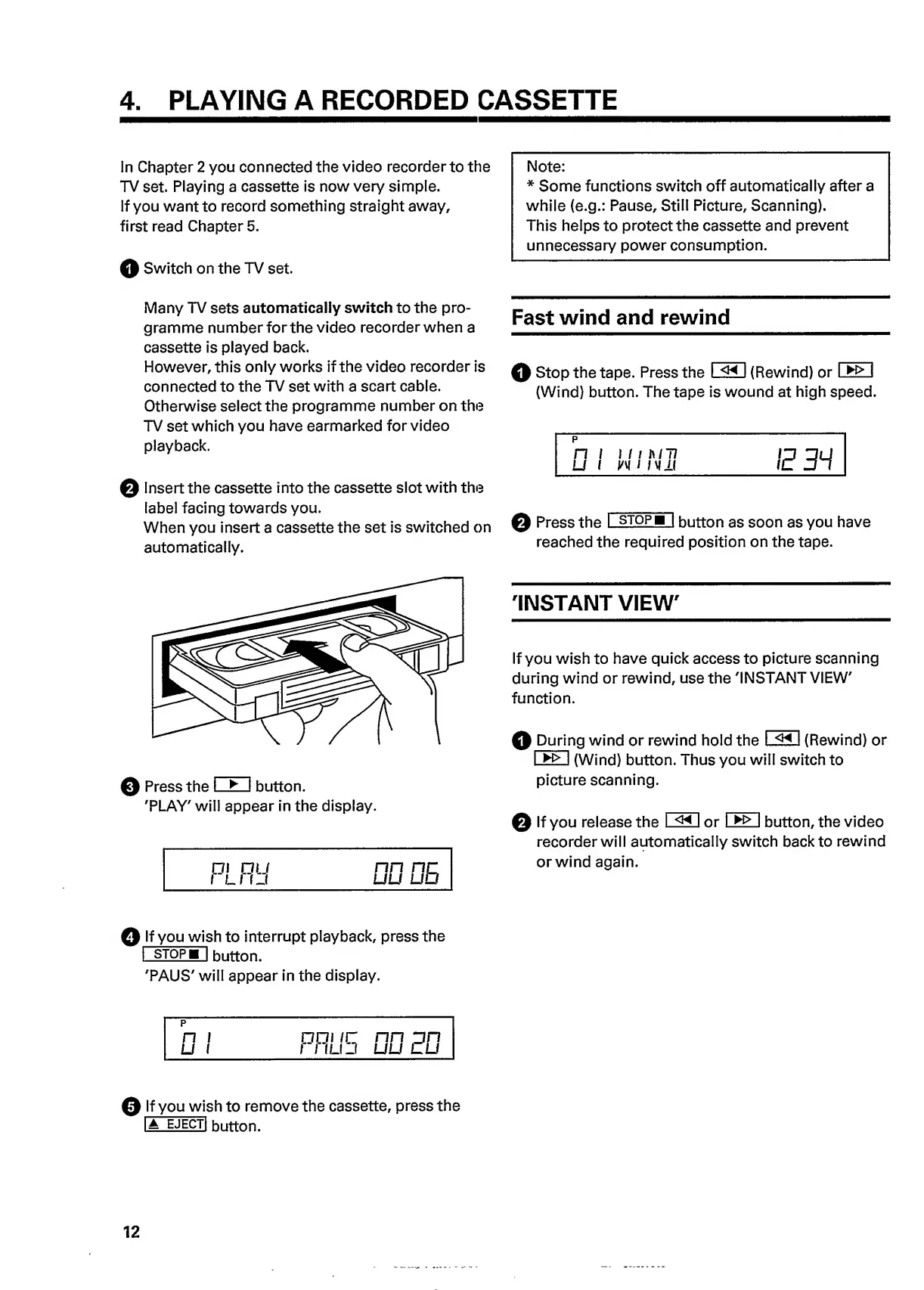 Philips VR 665 - 4. Playing Recorded Cassettes; Cassette Insertion and Playback Initiation