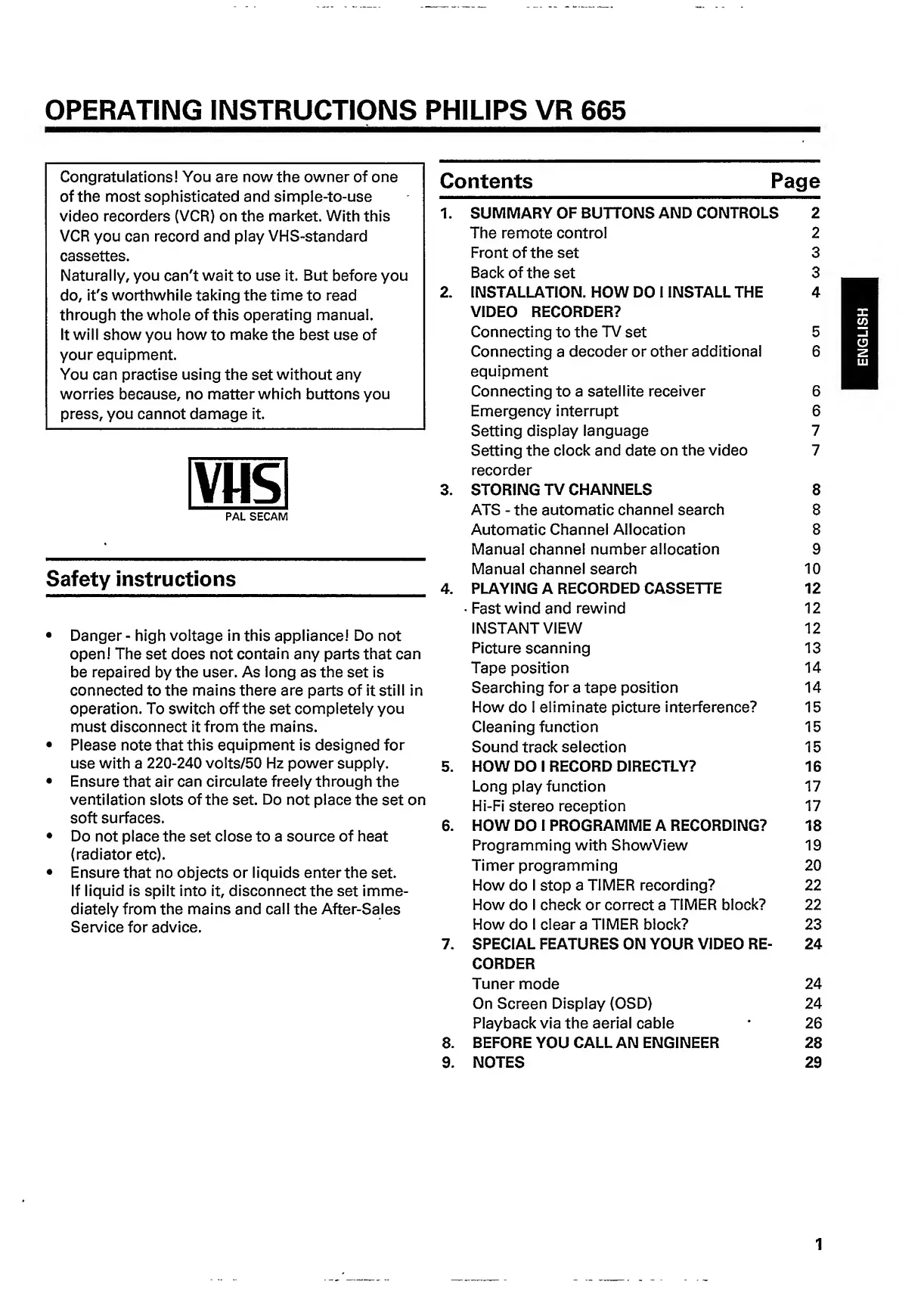 Philips VR 665 - Safety Instructions; High Voltage and Servicing Warning