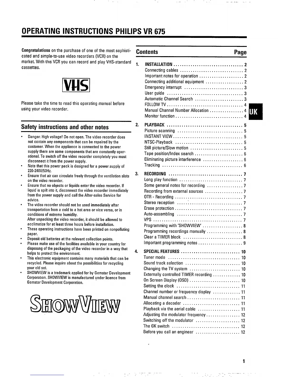 Philips VR 675 - Safety Instructions and Notes; 1. Installation; 2. Playback; 3. Recording