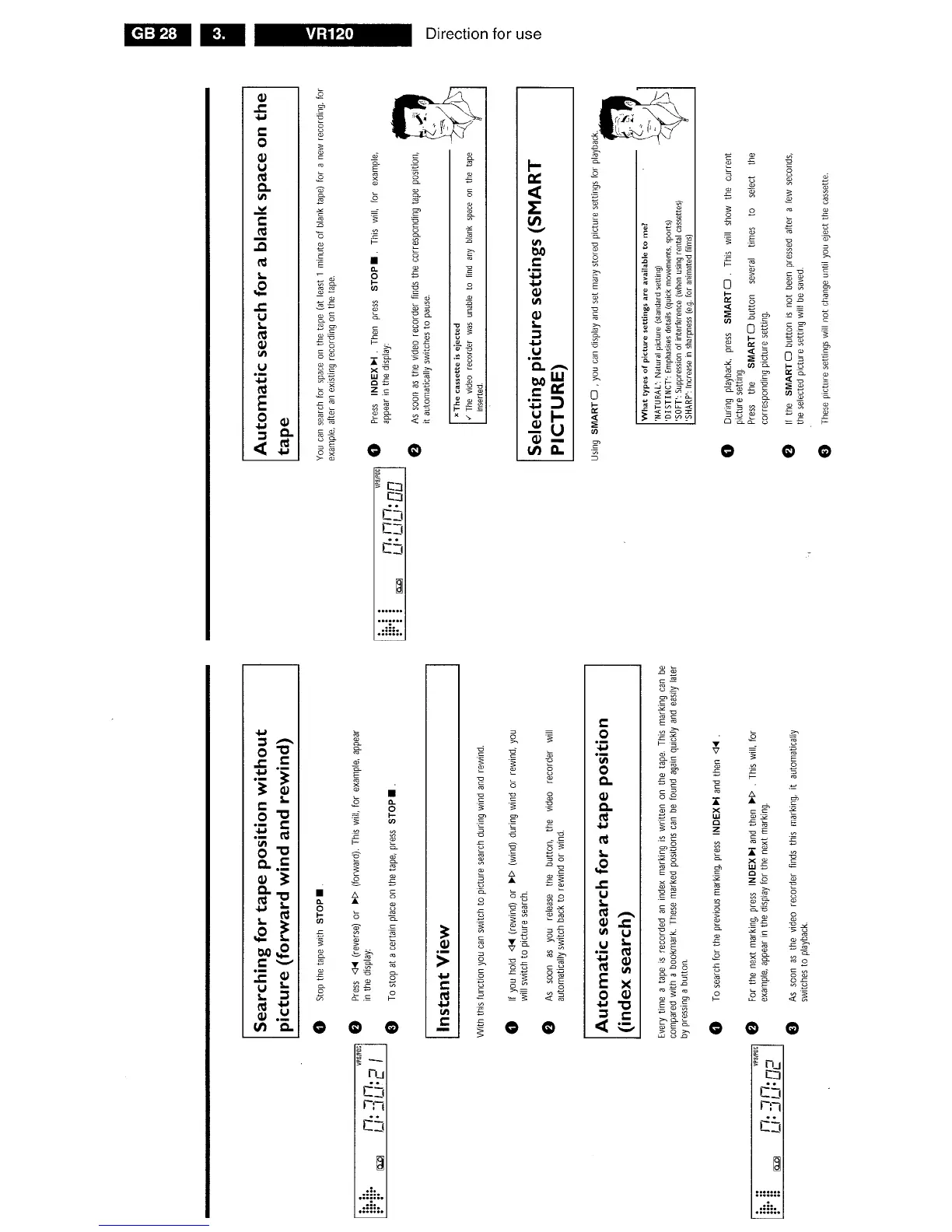 Philips VR120/-2 - Searching for Tape Position Without Picture; Instant View; Automatic Search for a Tape Position; Automatic Search for a Blank Space on the Tape