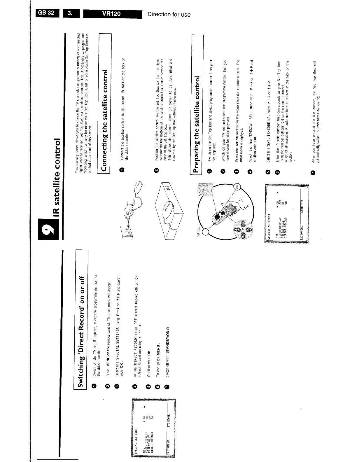 Philips VR120/-2 - IR Satellite Control; Switching Direct Record on or off; Connecting the Satellite Control; Preparing the Satellite Control