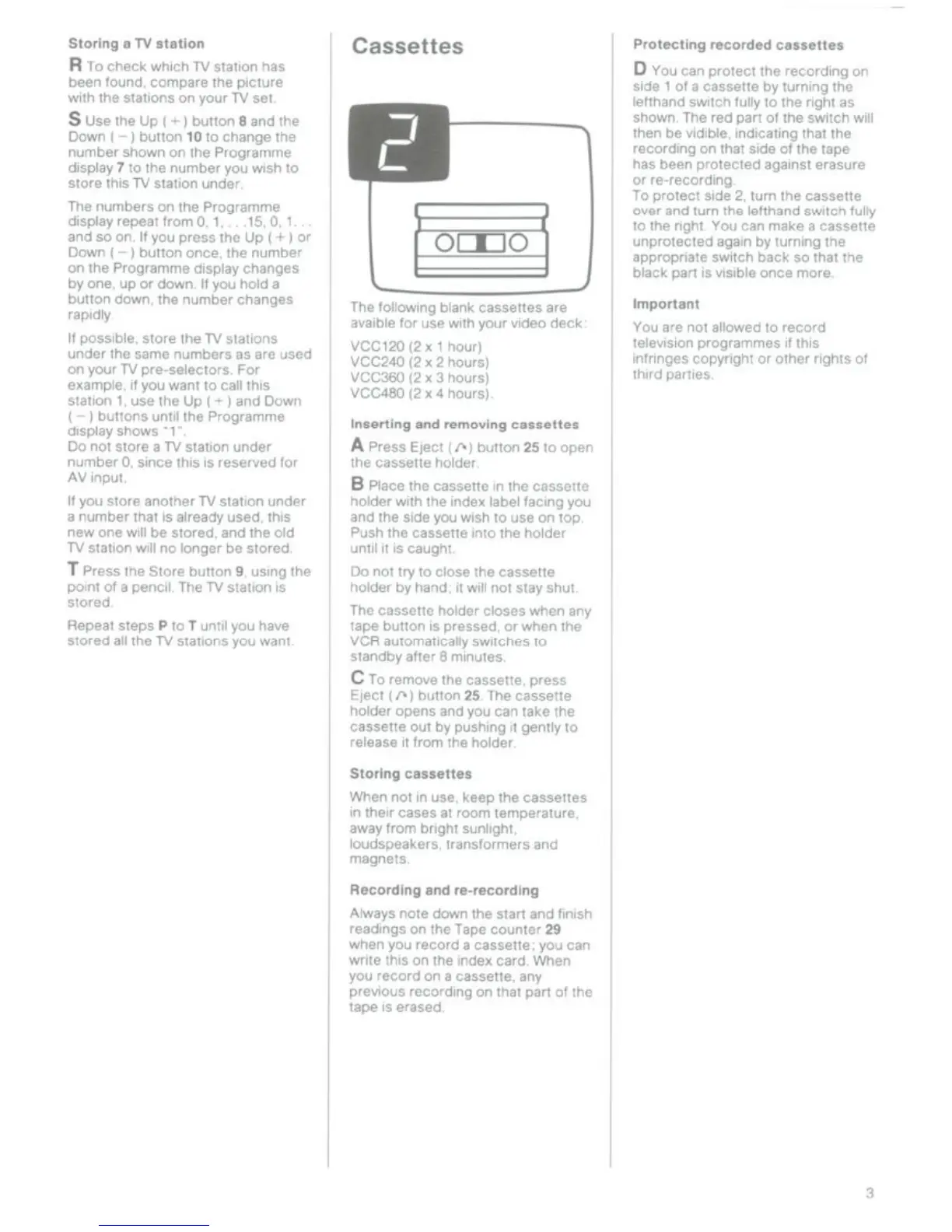 Philips VR2120 - Cassettes; Storing a TV Station; Inserting and Removing Cassettes; Storing Cassettes