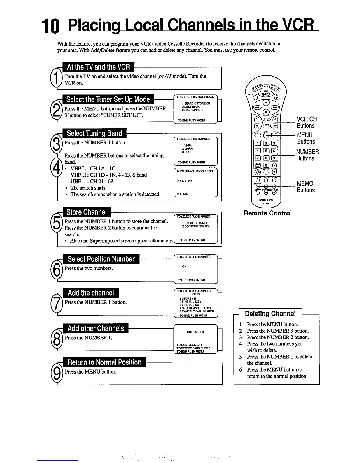 Philips VR457 - Placing Local Channels in the VCR; Select the Tuner Set up Mode; Select Tuning Band; Store Channel