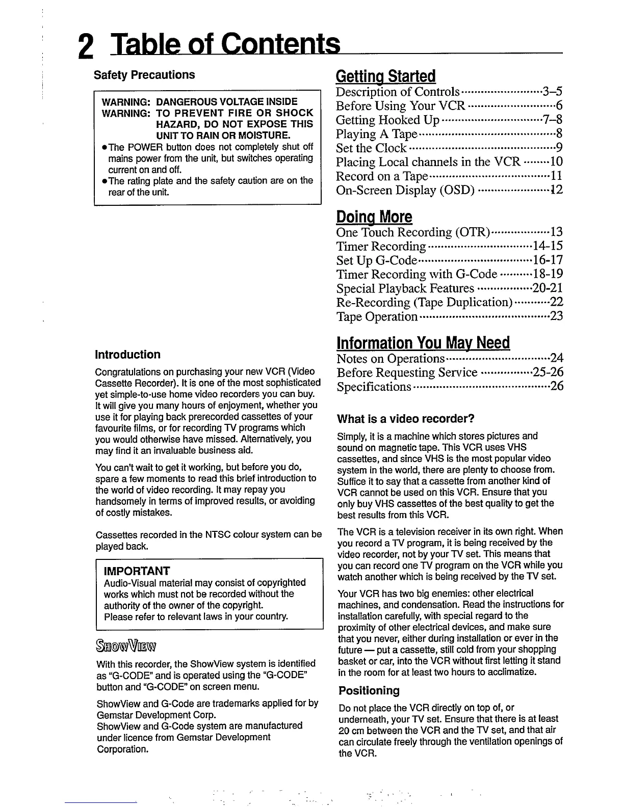 Philips VR457 - Table of Contents; Introduction; What Is a Video Recorder?; Positioning