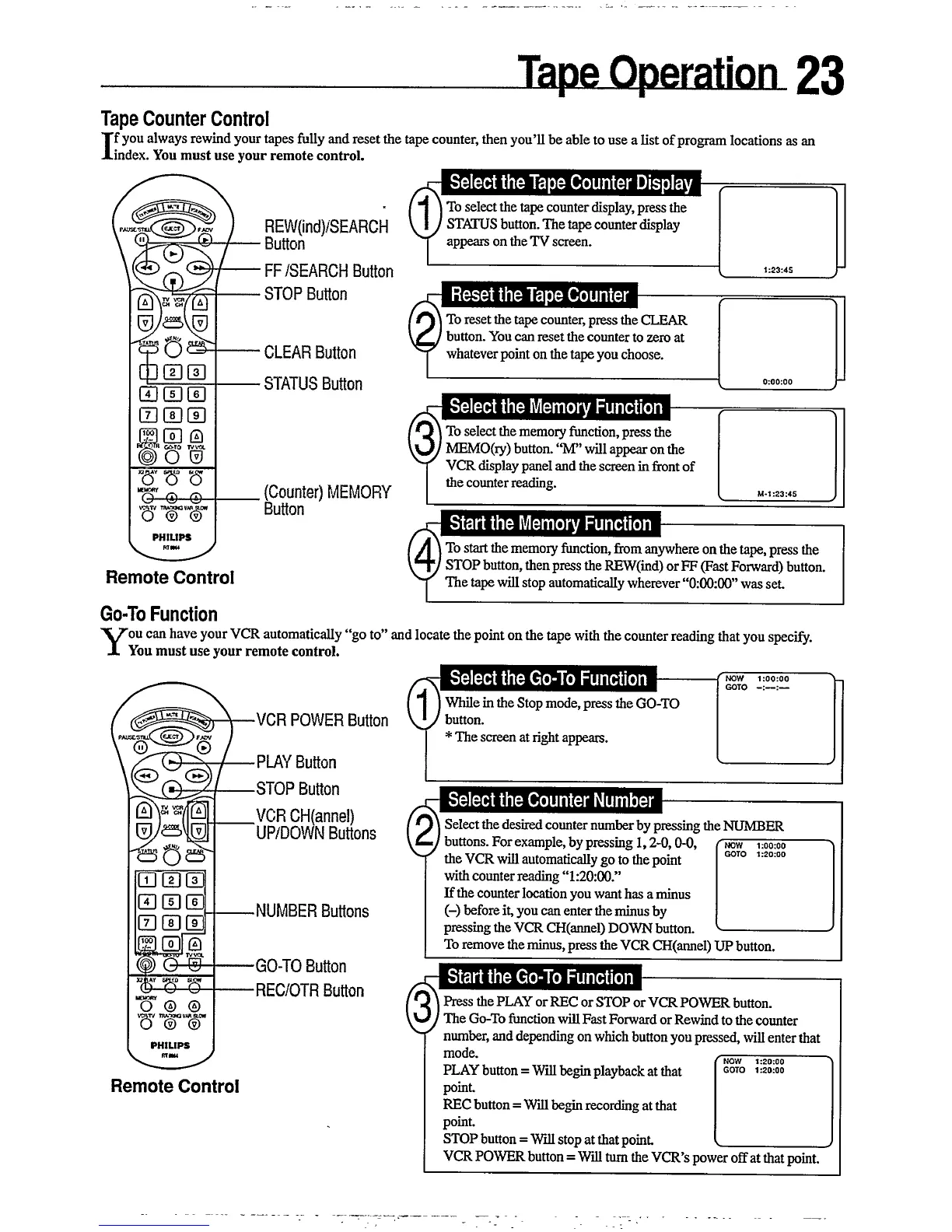 Philips VR457 - Tape Operation; Tape Counter Control; Go-To Function; Start the Memory Function