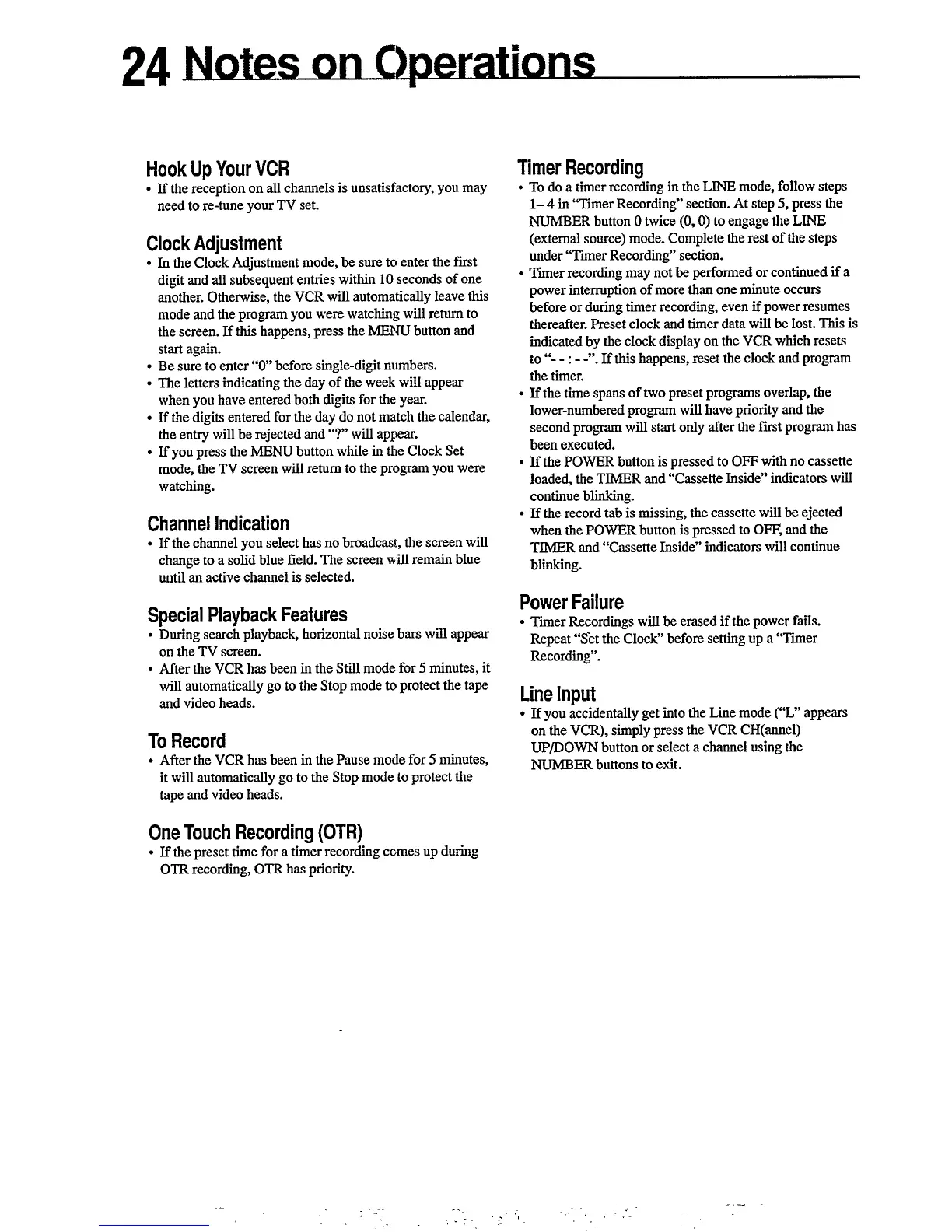 Philips VR457 - Notes on Operations; Hook up Your VCR; Clock Adjustment; Channel Indication