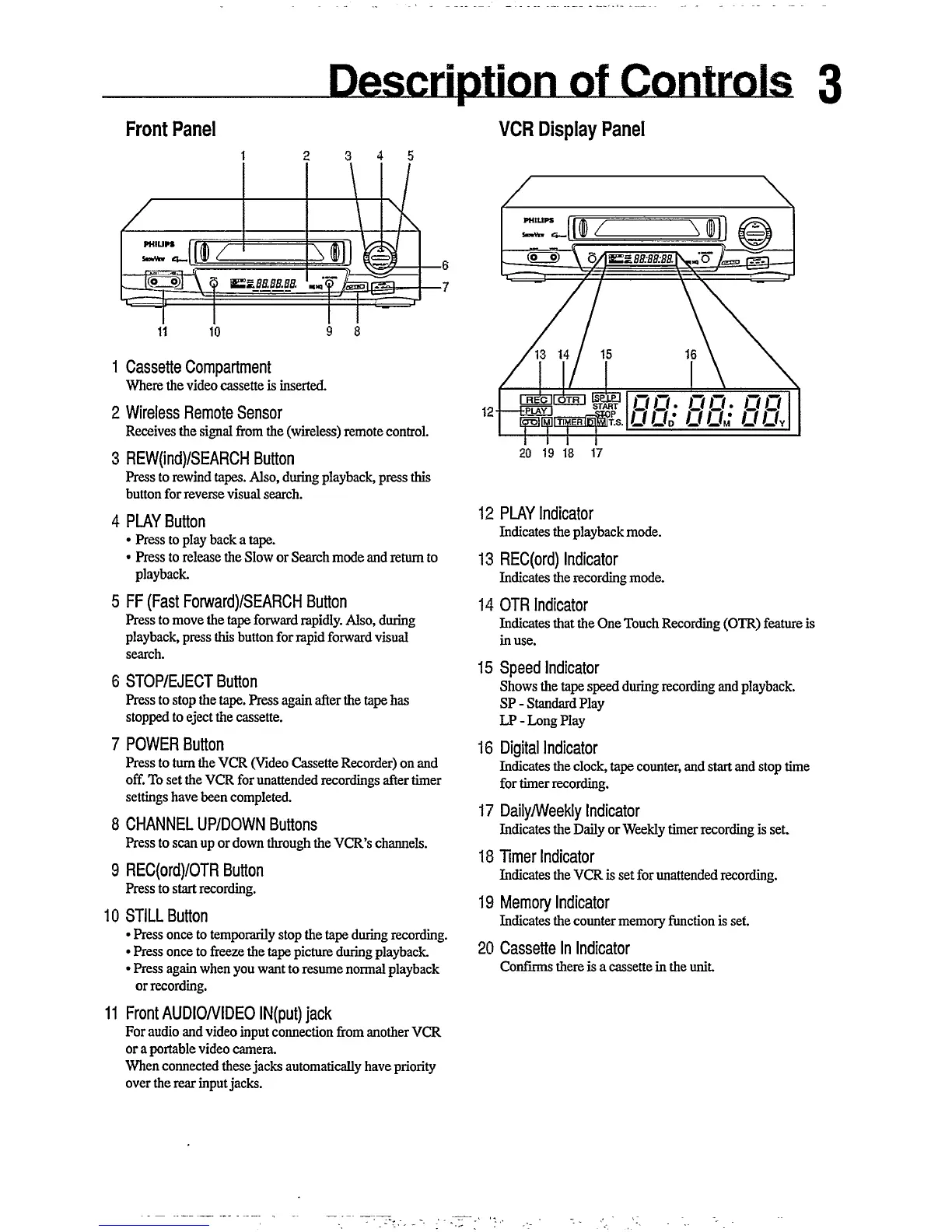 Philips VR457 - Description of Controls; Front Panel; VCR Display Panel