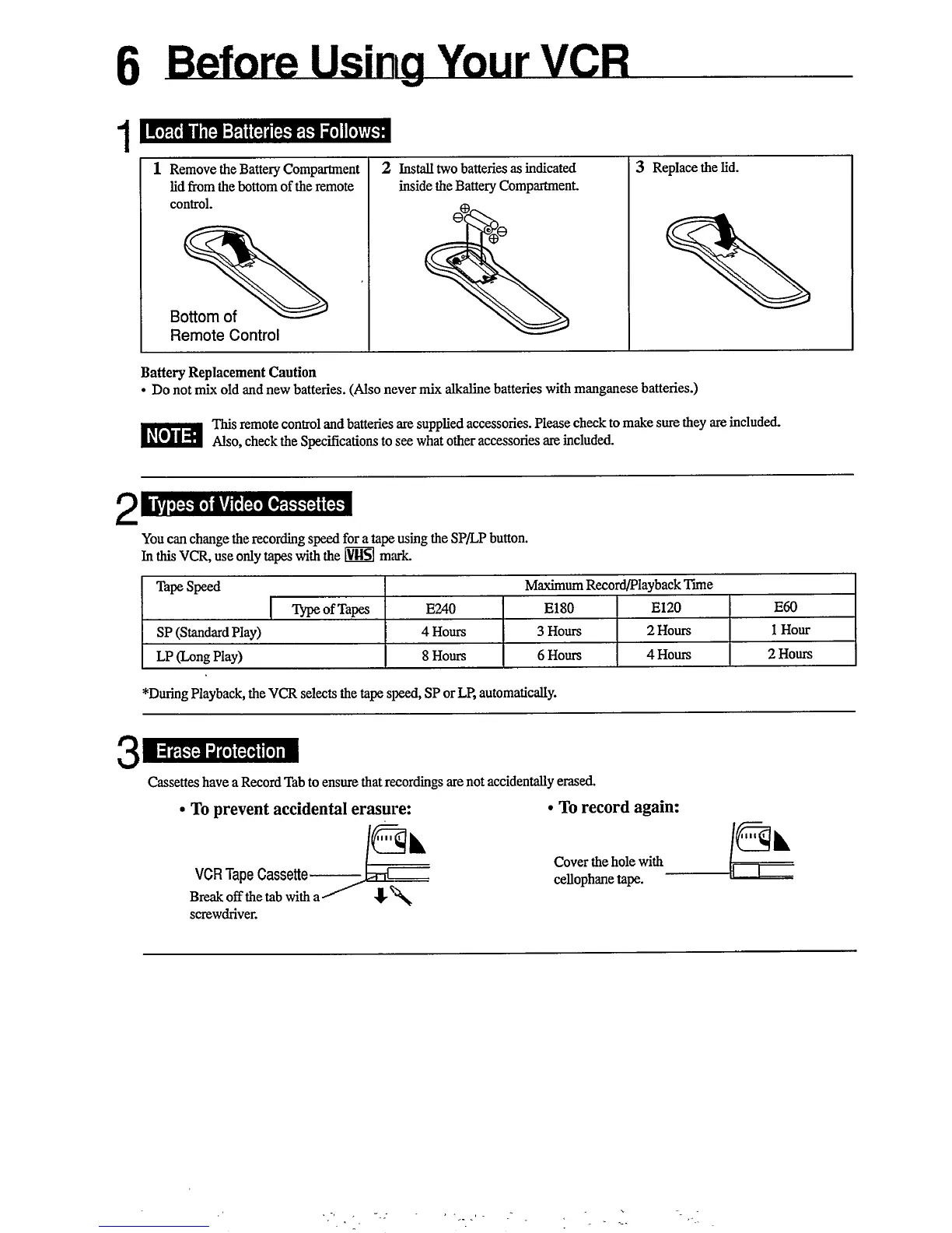 Philips VR457 - Before Using Your VCR; Load the Batteries; Types of Video Cassettes; Erase Protection