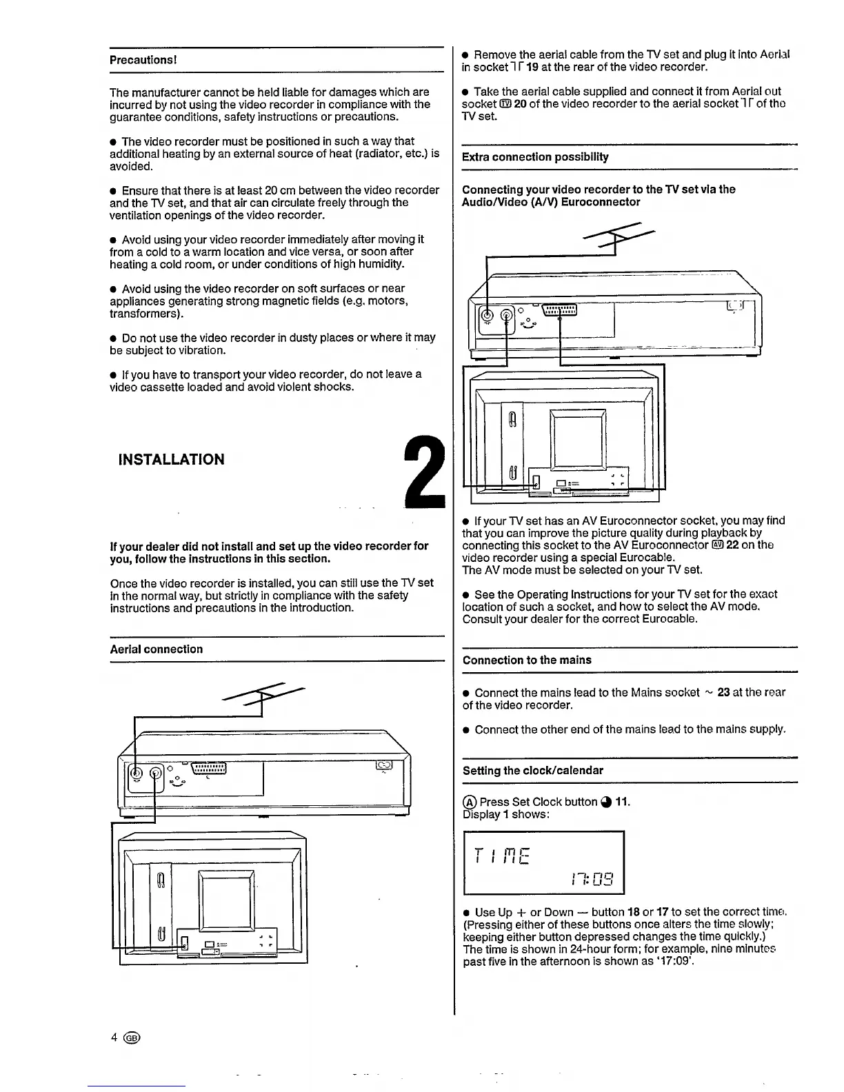 Philips VR6180 - Installation; Aerial Connection; Extra Connection Possibility; Setting the Clock;Calendar