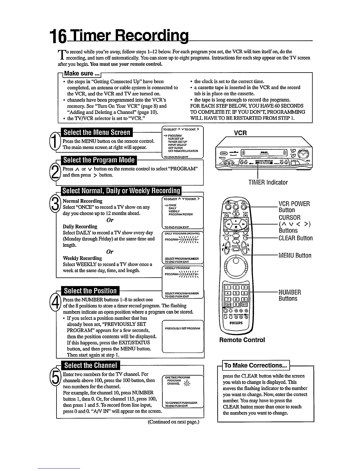 Philips VR756/50 - Timer Recording Setup; Selecting the Timer Recording Menu Screen; Choosing the Program Mode (Once, Daily, Weekly); Selecting Normal, Daily, or Weekly Recording