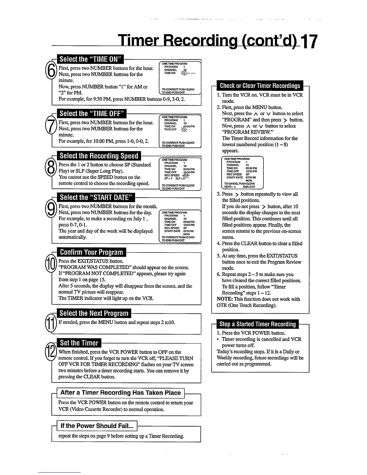 Philips VR756/50 - Timer Recording Setup (Continued); Setting the Recording Start Time (TIME ON); Setting the Recording End Time (TIME OFF); Selecting the Recording Speed (SP;SLP)