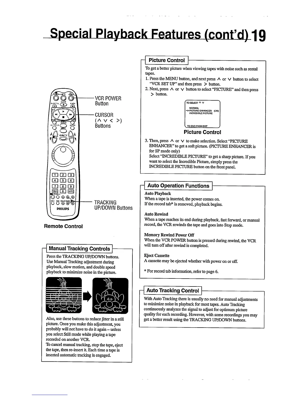 Philips VR756/50 - Special Playback Features (Continued); Picture Quality Control; Auto Operation Functions; Auto Tracking Control