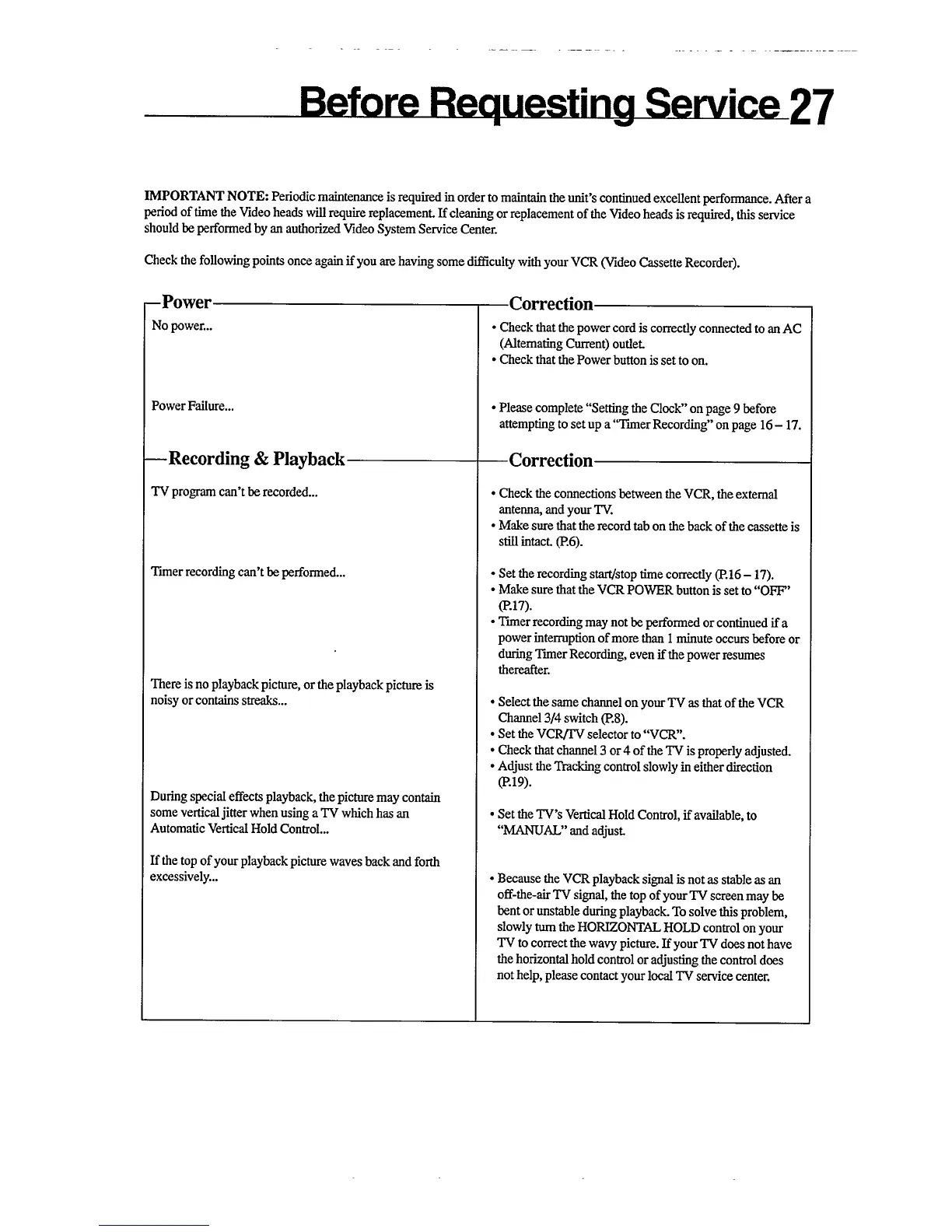 Philips VR756/50 - Before Requesting Service; Power Issue Troubleshooting; Recording and Playback Troubleshooting