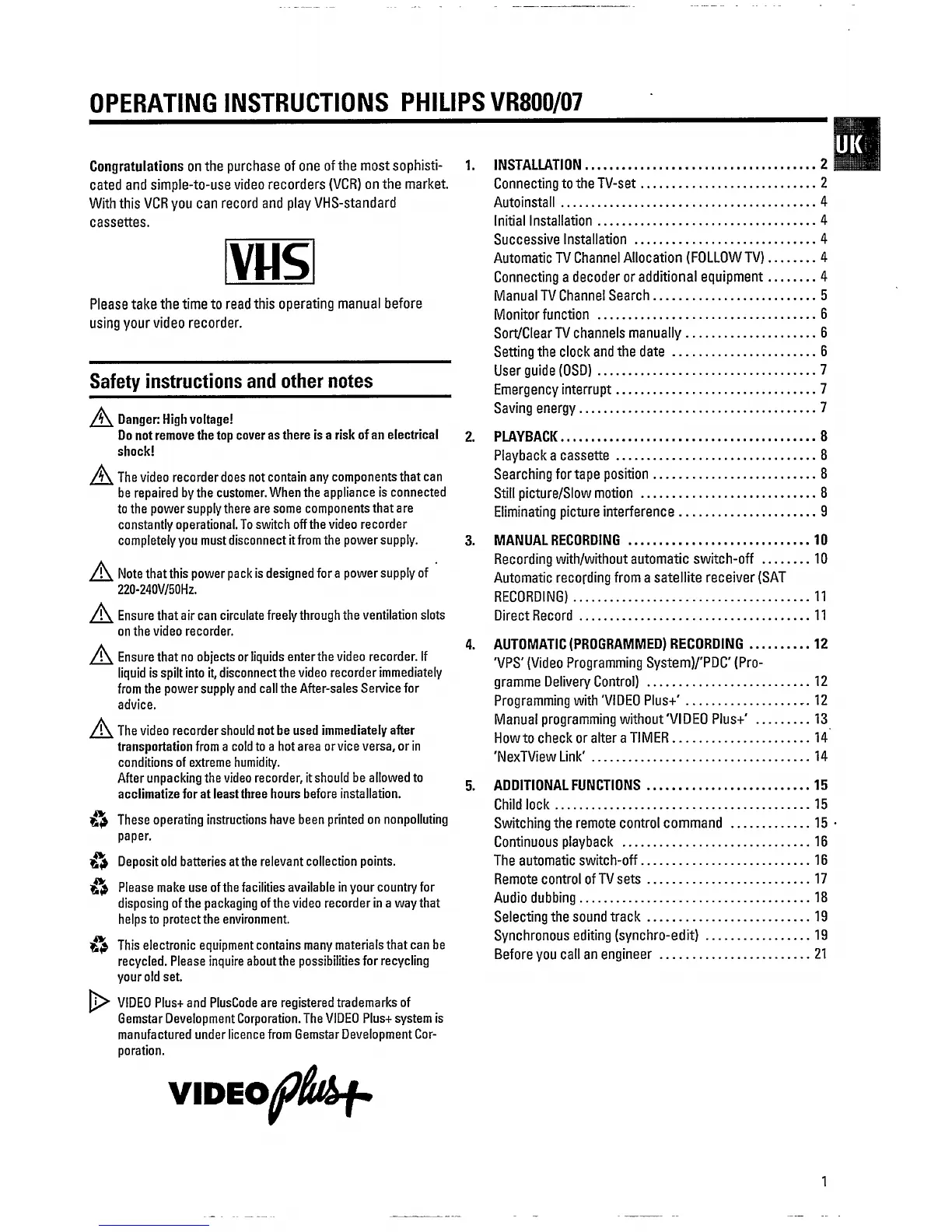 Philips VR800 - Installation; Playback; Manual Recording; Automatic Recording