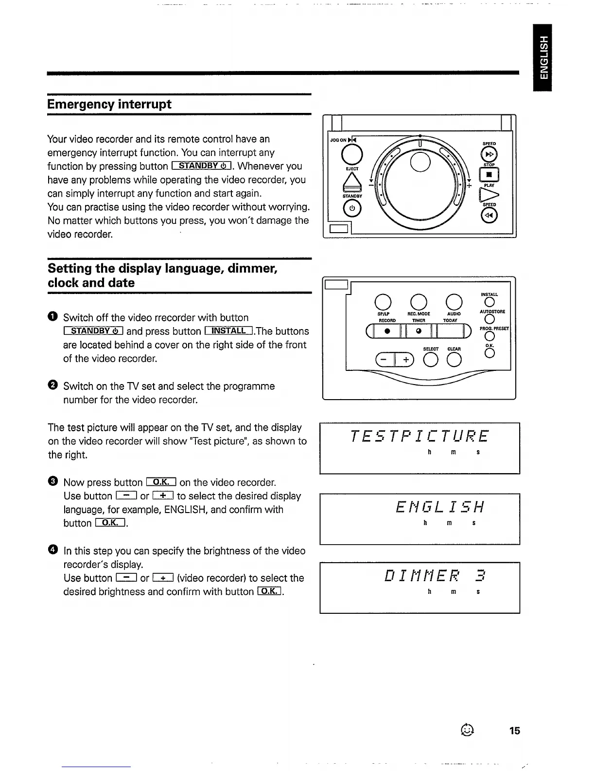 Philips VR833 - Emergency Interrupt; Setting the Display Language, Dimmer, Clock and Date