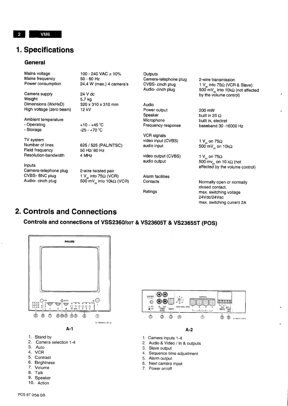 Philips VS23605T - Specifications; General Specifications; Controls and Connections; POS Model Controls