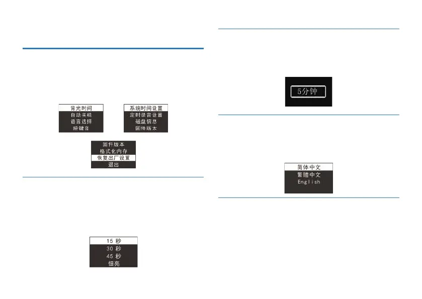 时间、自动关机、语言选择、按键音、系统时间设置、定时录