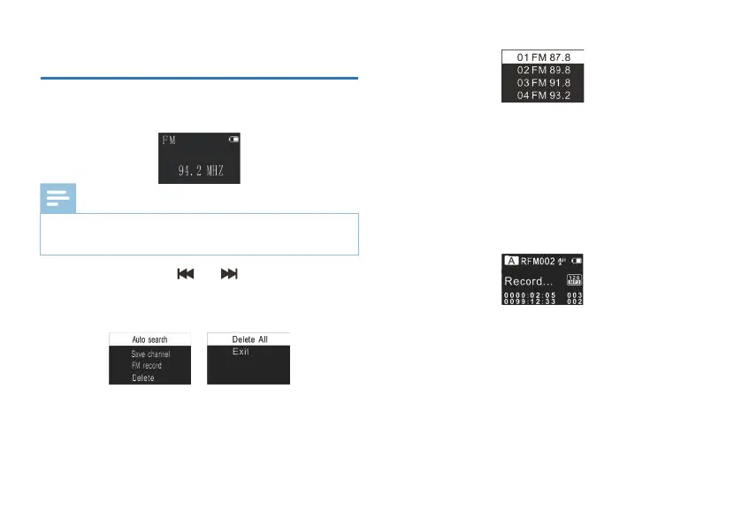including: Auto search, Save Channel, FM record, Delete, Delete