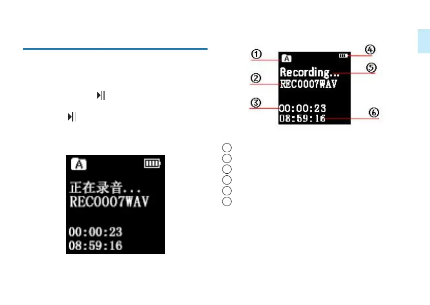 (2) 录音状态下,长按 ”键 2~3 秒暂停录音,显示屏显示