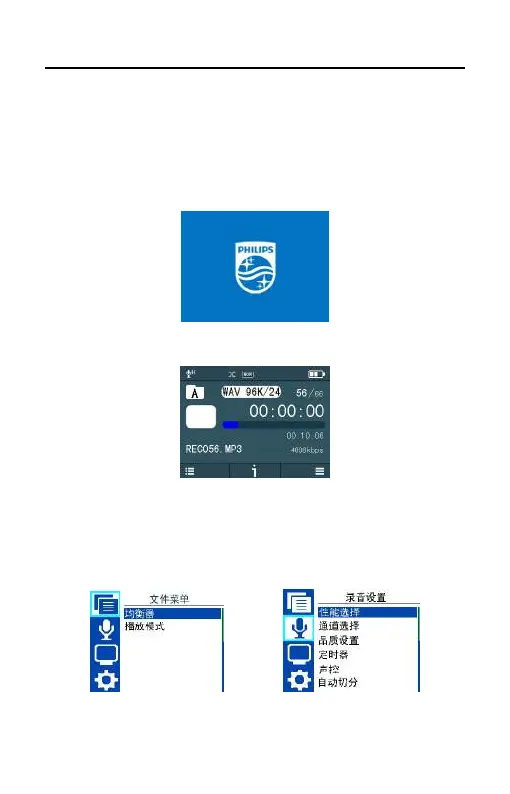 在此界面停止状态下短按菜单键选择菜单图标,按录音键确