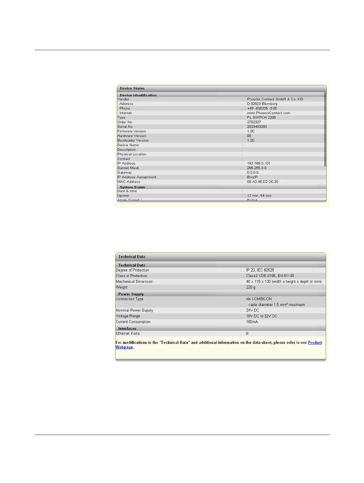 Figure 5-5 “Technical Data” web page