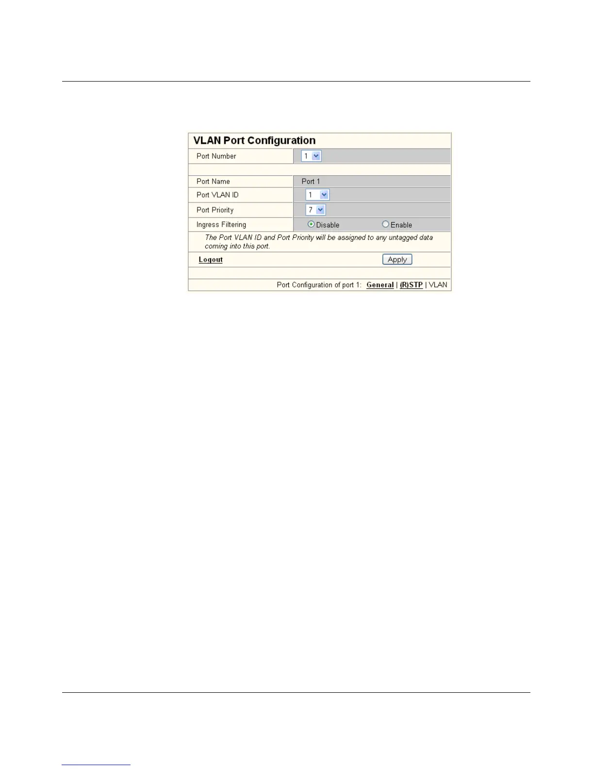 relevant port number opens the "VLAN Port Configuration" web page, where the settings