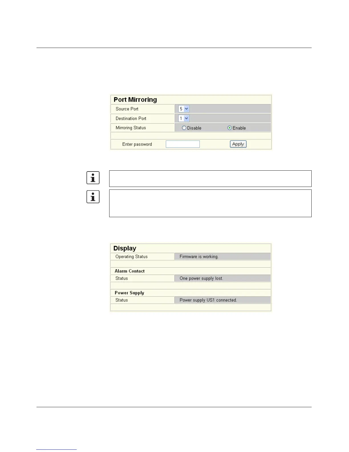 Activation/deactivation and setting of port mirroring. Port mirroring is used to passively read