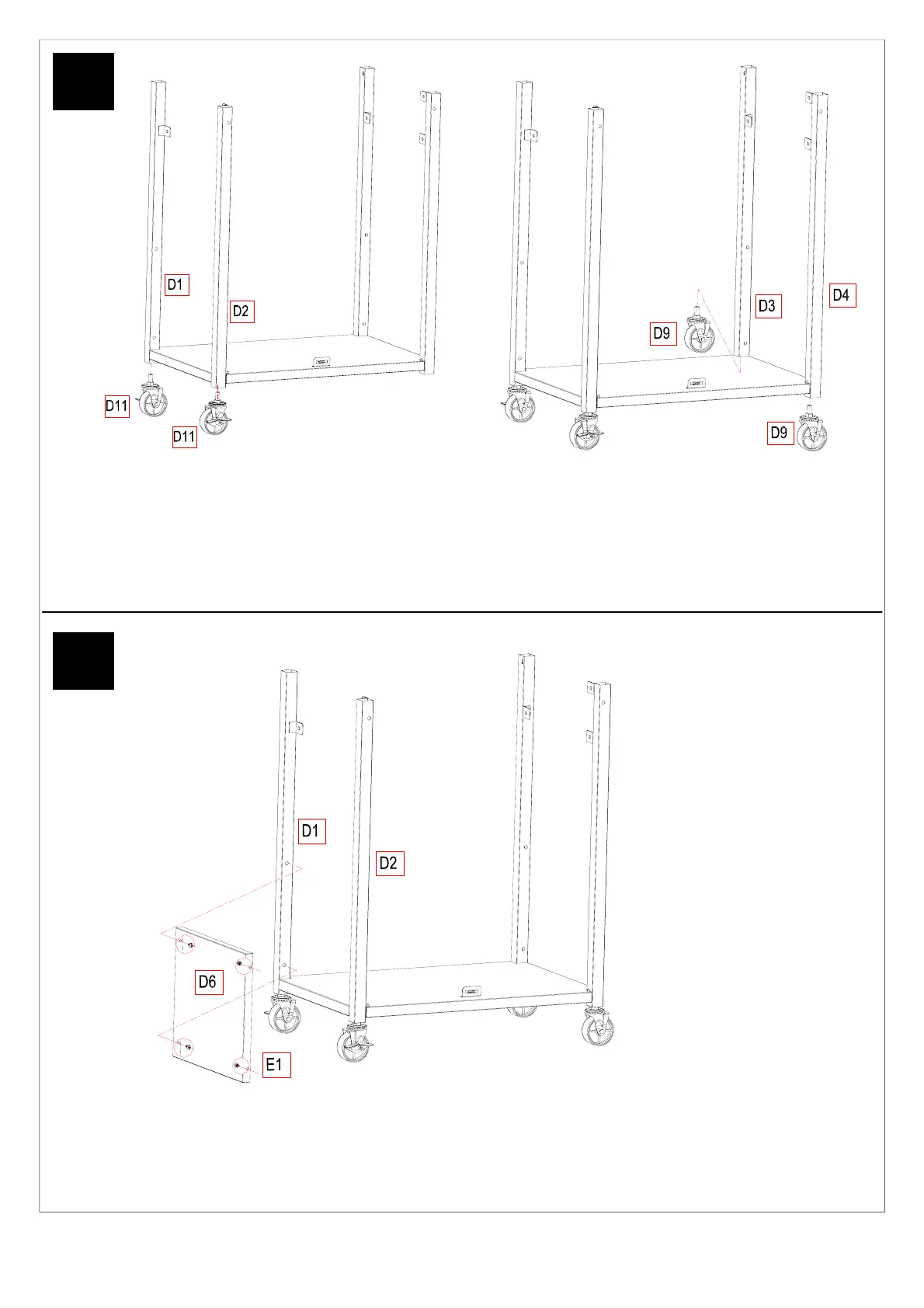 Fix the Cart Side Panel (D6) on the Left Front Leg (D2) and Left Rear Leg (D1) using M6*12 bolts (E1) as fig 4.