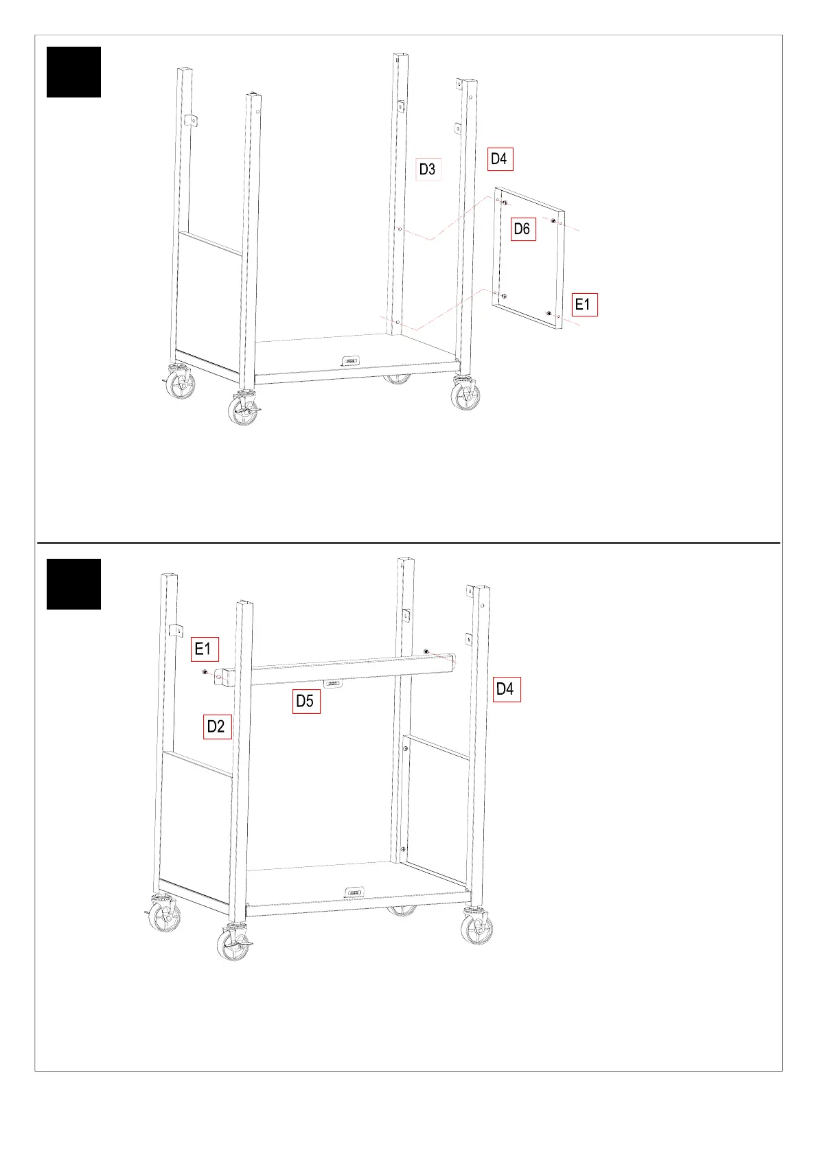 Fix the Cart Side Panel (D6) on the Right Front Leg (D4) and Right Rear Leg (D3) using M6*12 bolts (E1) as