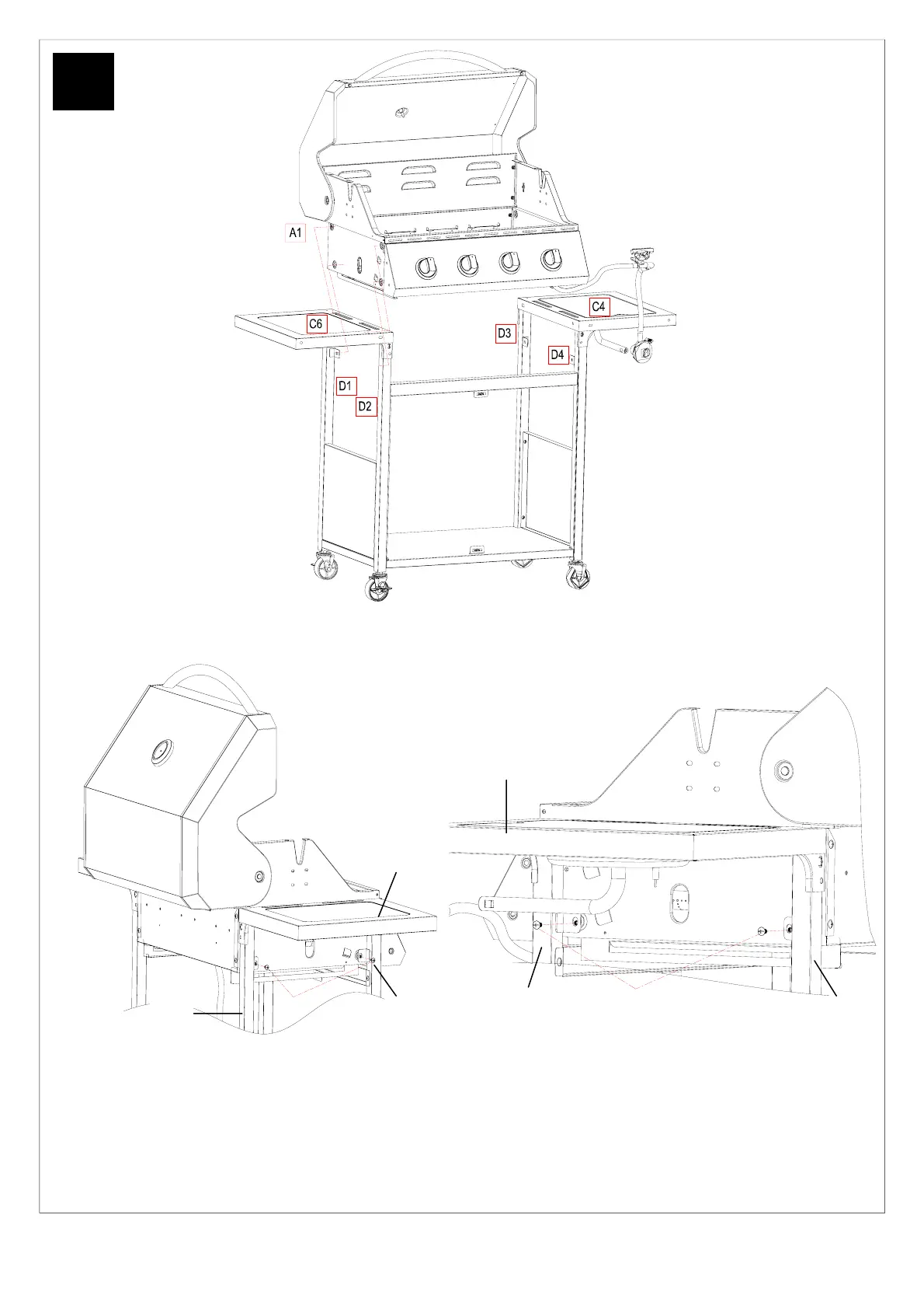 Fix the Right Front Leg (D4) and Right Rear Leg (D3) on the Grill Assembly (A1) using M6*12 bolt (E1) as