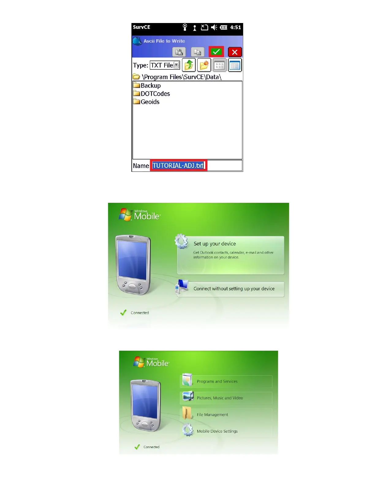 7. Within WMDC, select “Connect without setting up your device”, then “File Management” and “Browse the contents of