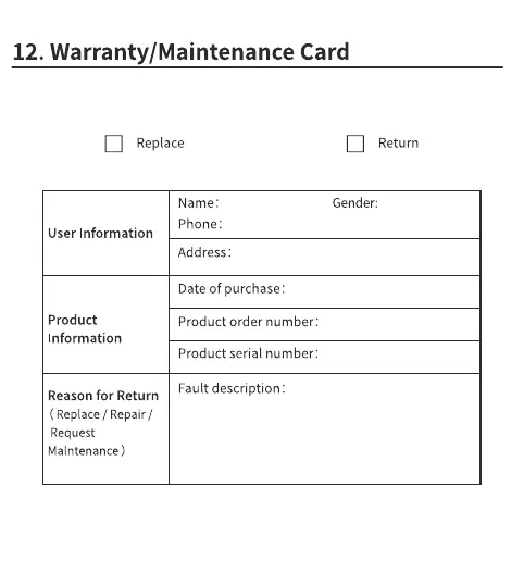 12. Warranty/Maintenance Card