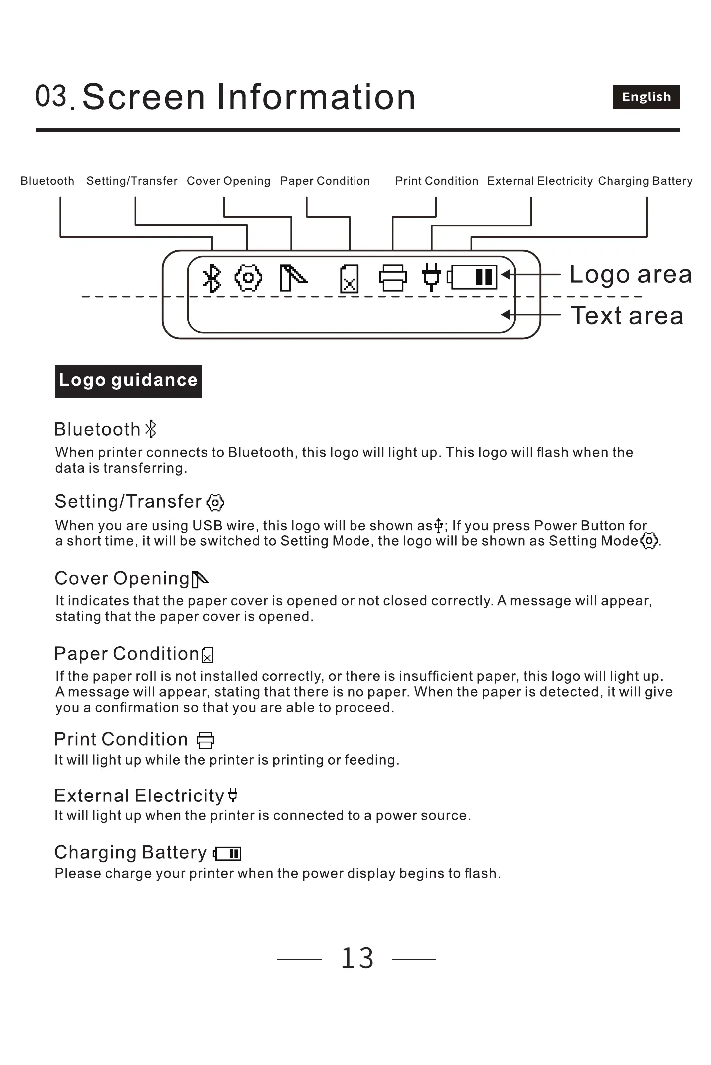 When printer connects to Bluetooth, this logo will light up. This logo will flash when the