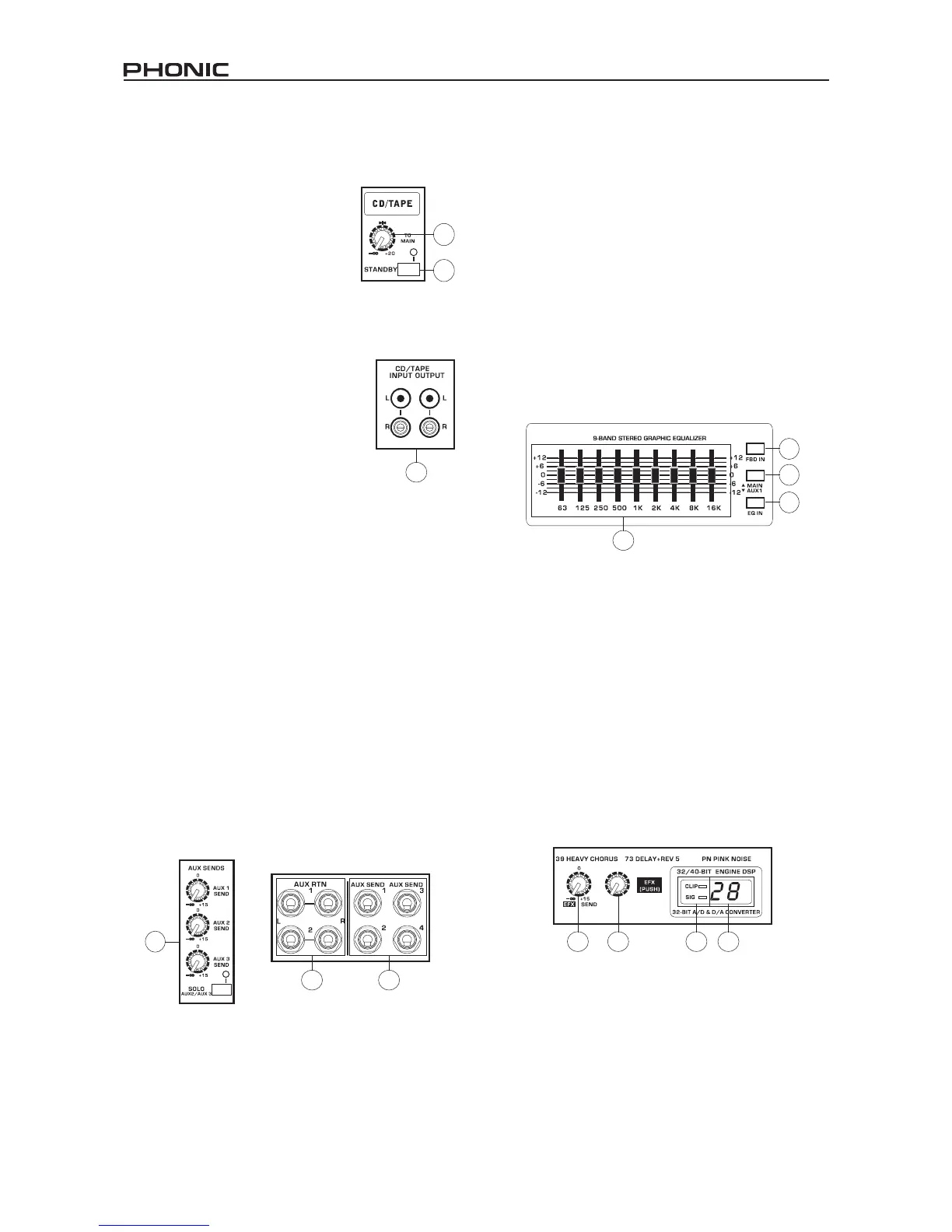 from each channel’s individual AUX send controls. Pushing the