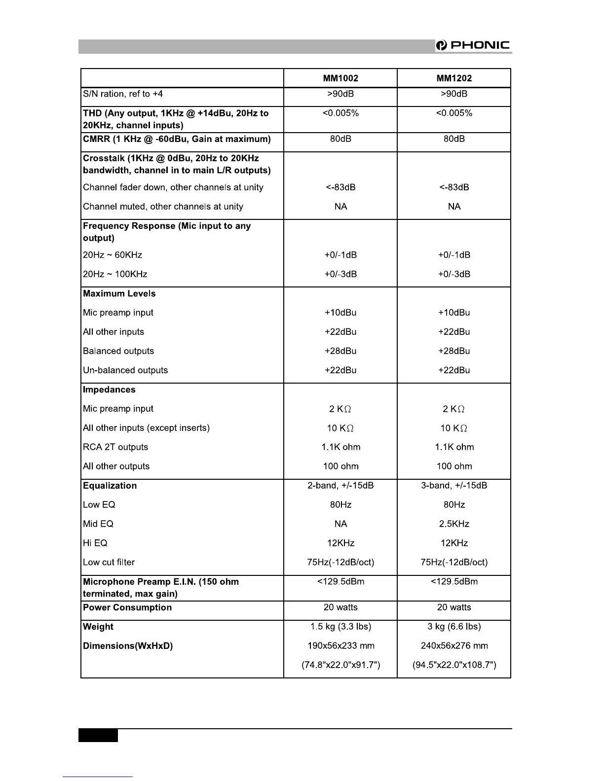 Phonic MM1002 - Technical Specifications - Part 2; Noise, Frequency Response, and Levels; Impedances, EQ, and Power Consumption