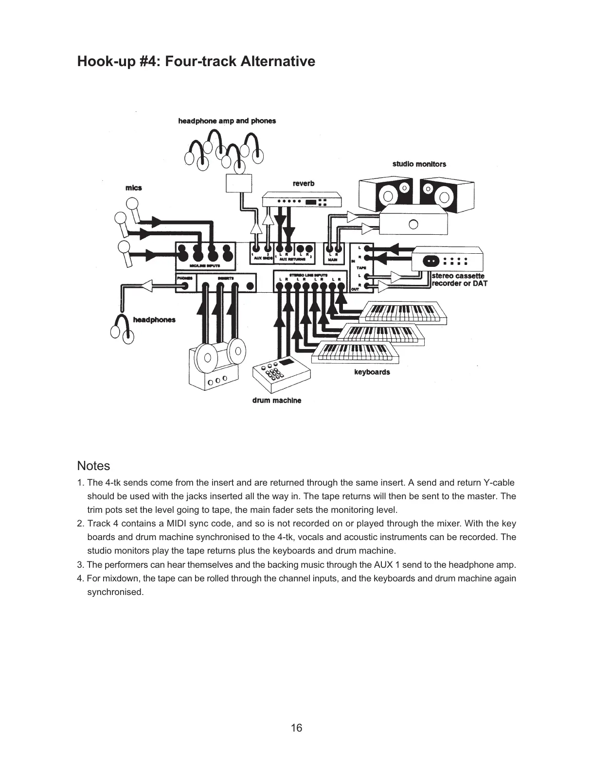 2. Track 4 contains a MIDI sync code, and so is not recorded on or played through the mixer. With the key
