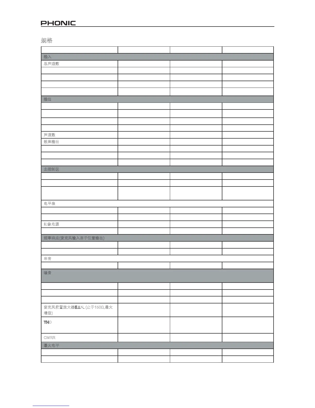 噪音(20Hz~20KHz; 测量Main Output, 声道1-4单位增益; EQ平坦;所有声道位于Main Mix; 声道1/3位于最左侧, 声道2/4位于最右侧.参考