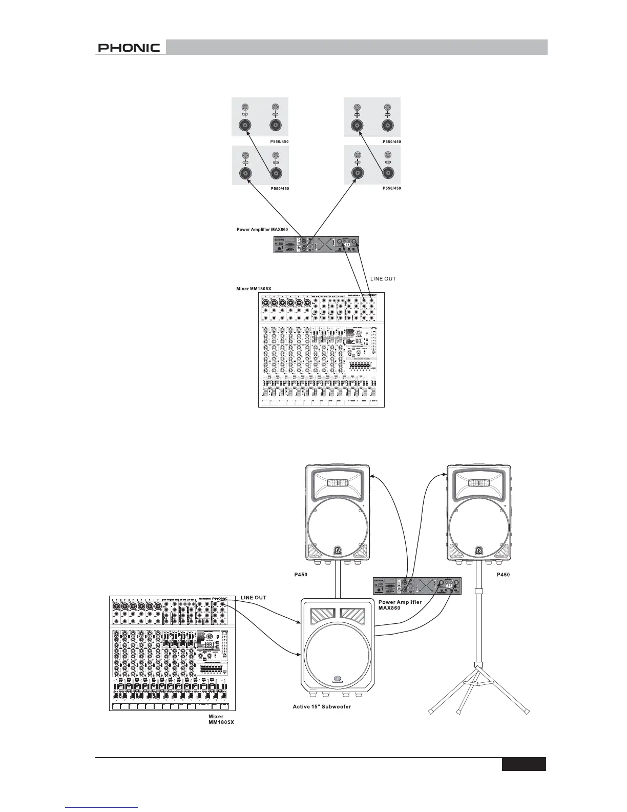 Phonic P450 - Application Setups; Stereo Setup; Stereo Setup with Subwoofer
