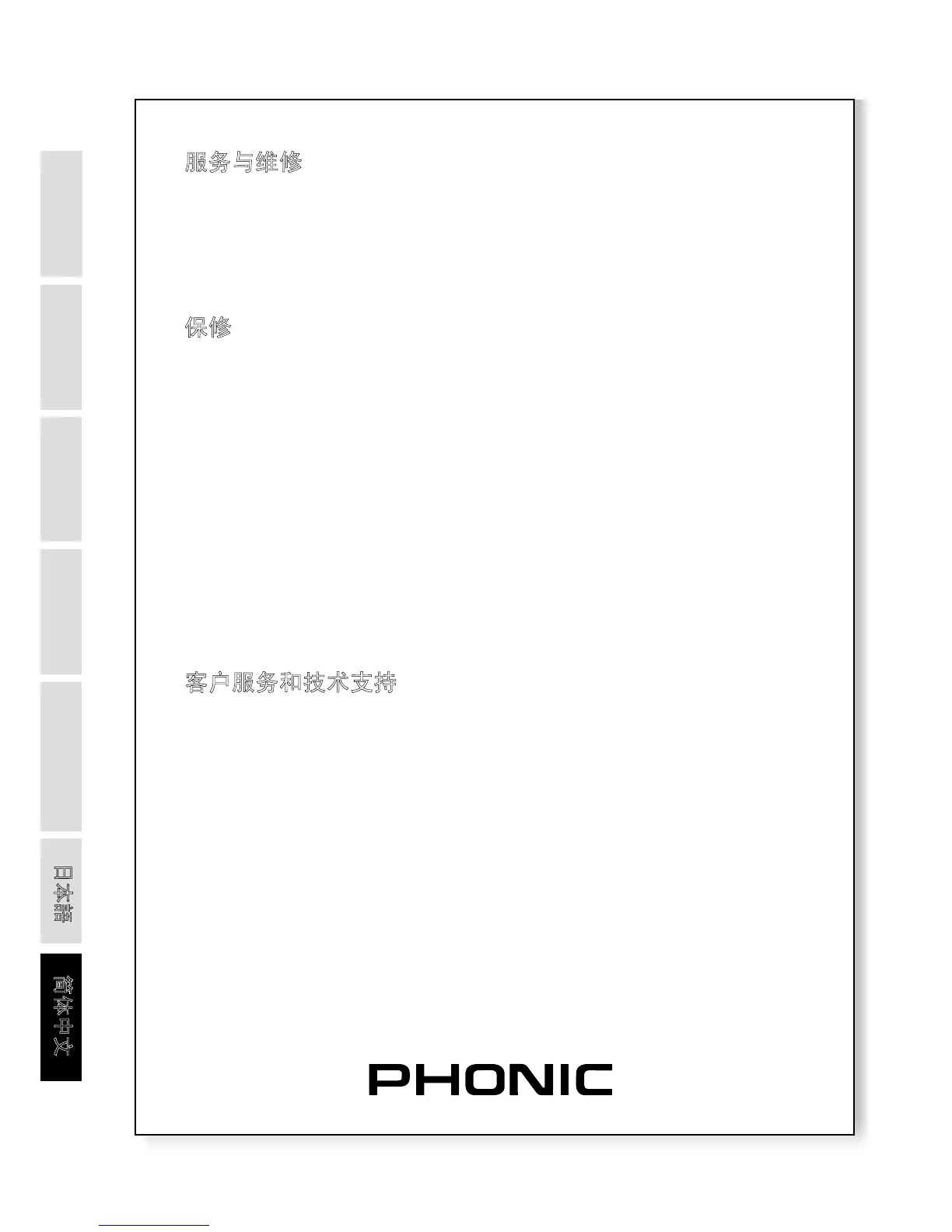 如需更换零件,服务和维修,请联系您所在国家的Phonic代理商。Phonic不向