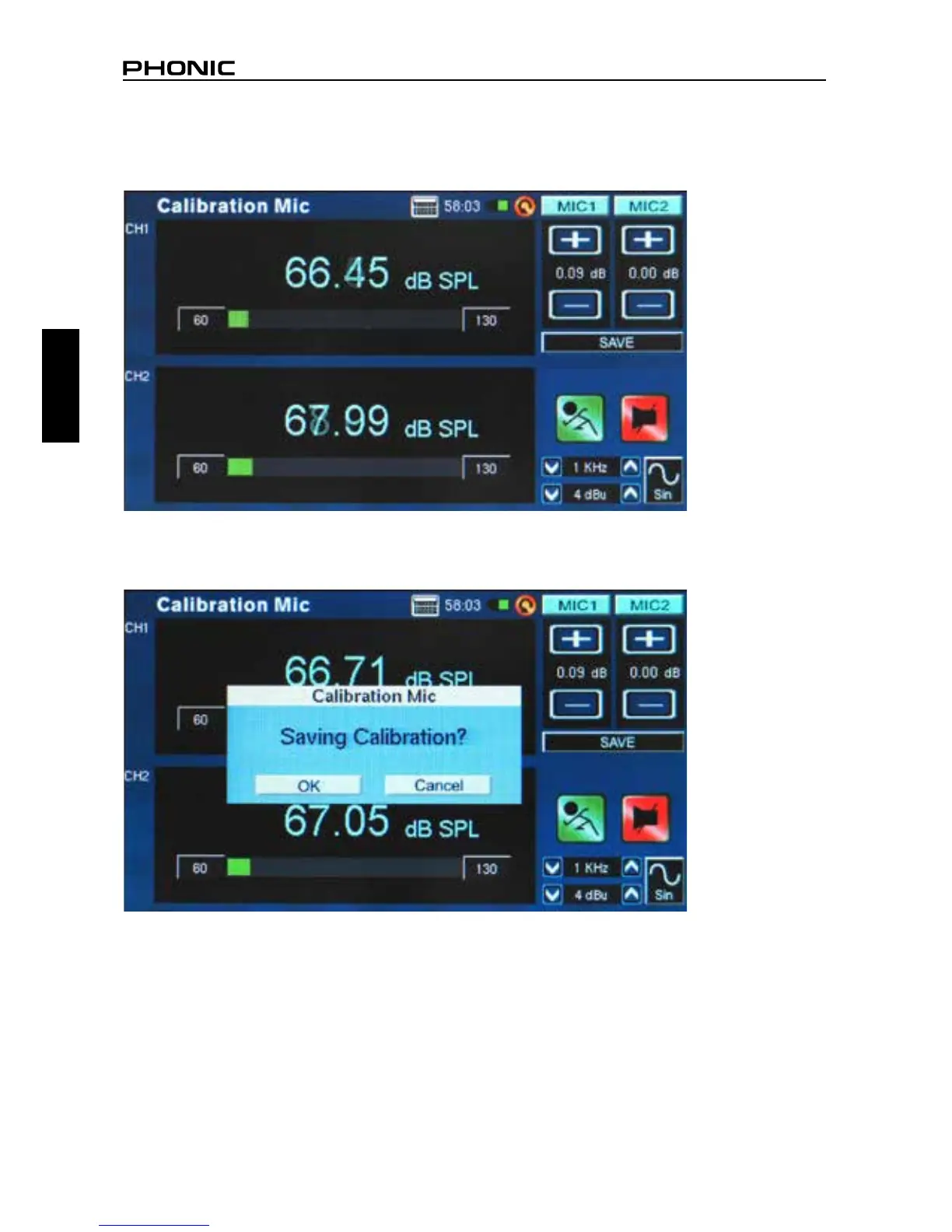 4. Ajuste el nivel medido del calibrador SPL presionando los botones “+” y “-“ hasta que el nivel sea igual