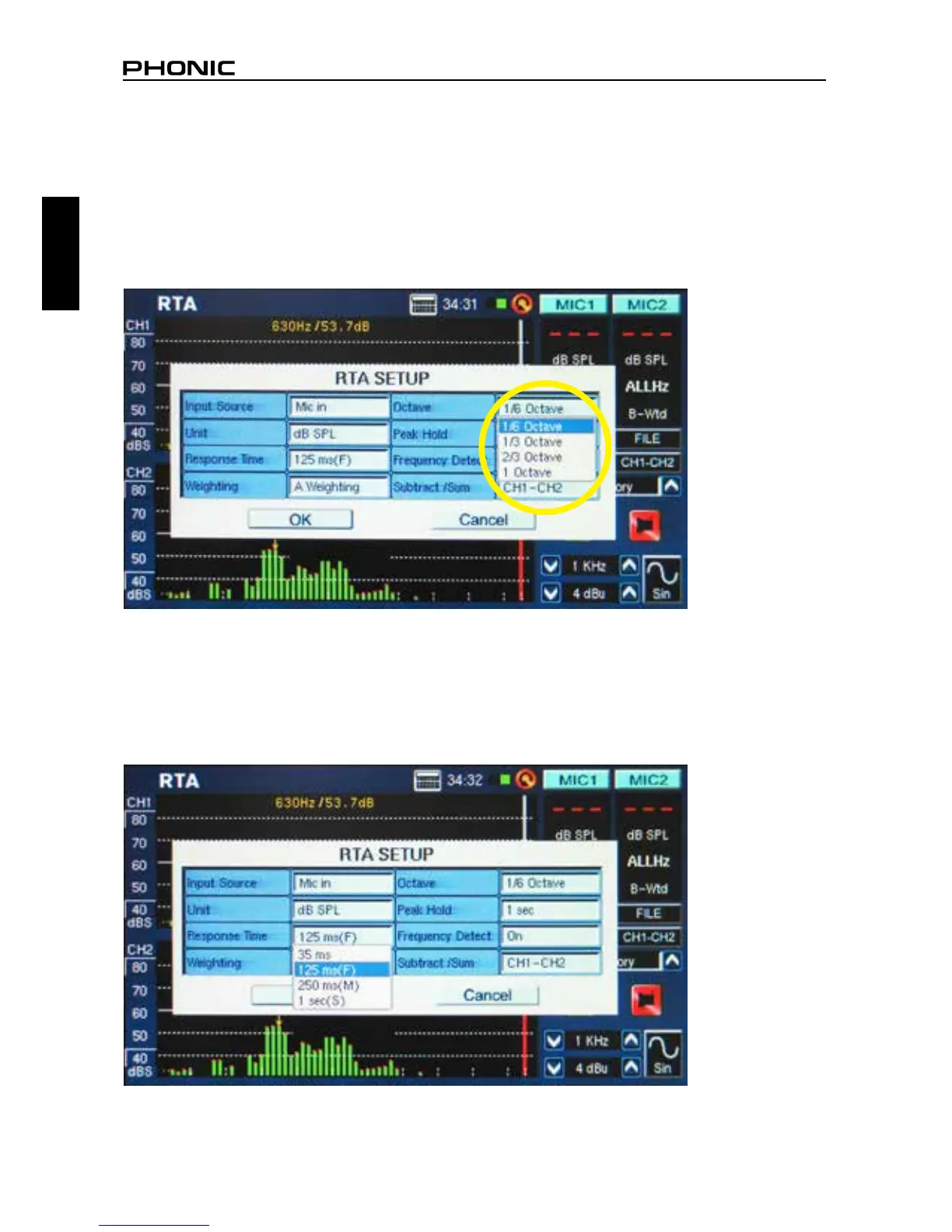 15). Each frequency band is graphed as a vertical bar on the RTA, the height of which represents the