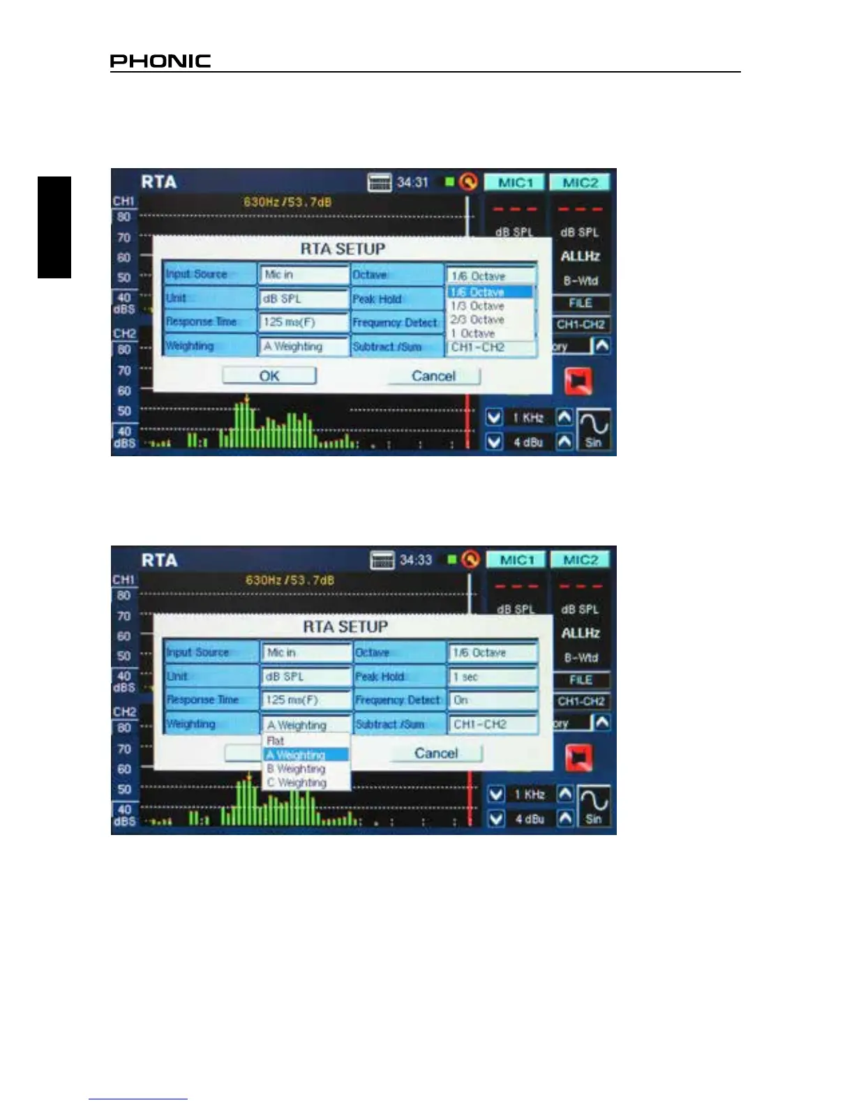 octave resolution (for a total of 10 bands on the RTA), 2/3 octave resolution (for a total of 15 bands),