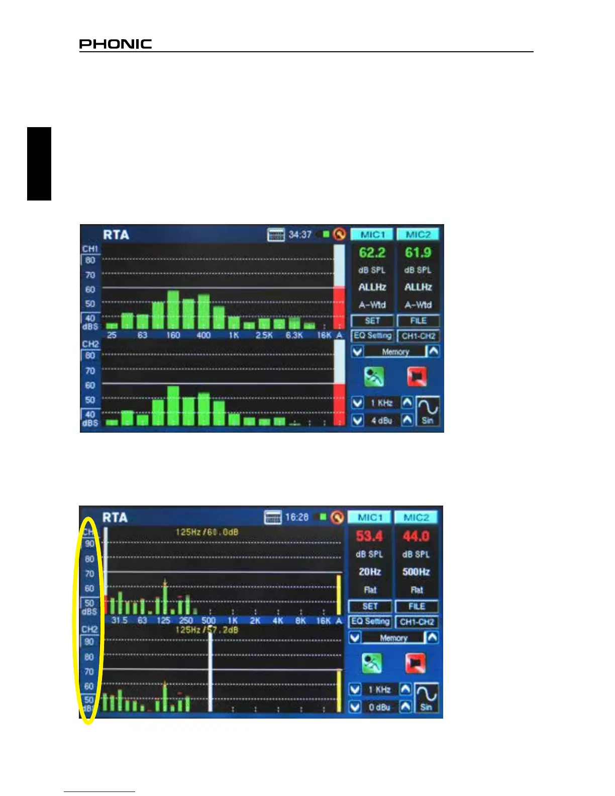 the dB SPL results for the currently selected band, below which you will nd the center frequency