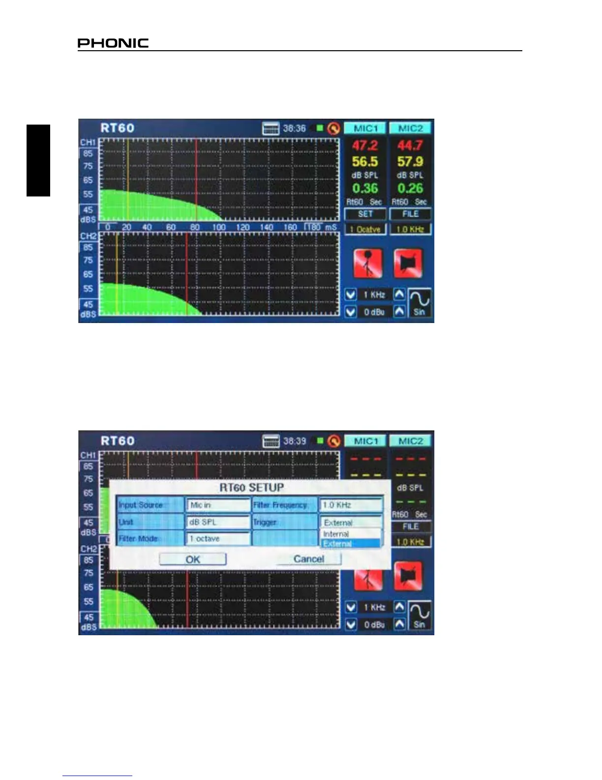 External: Use this mode to trigger the RT60 calculations using an external sound impulse, such as
